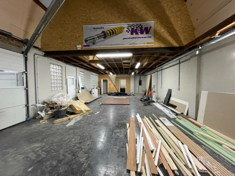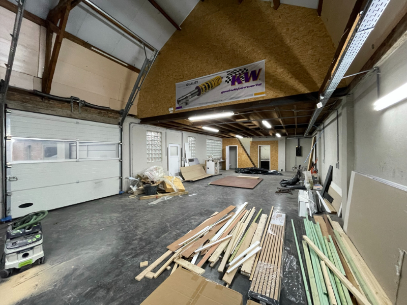 233m² magazijn bestaande uit 132m² gelijkvloerse ruimte met 101m² mezzanine te huur gelegen Kalken, Schriekstraat 6.