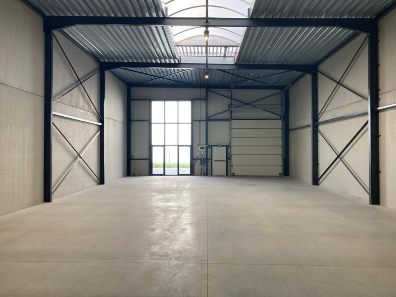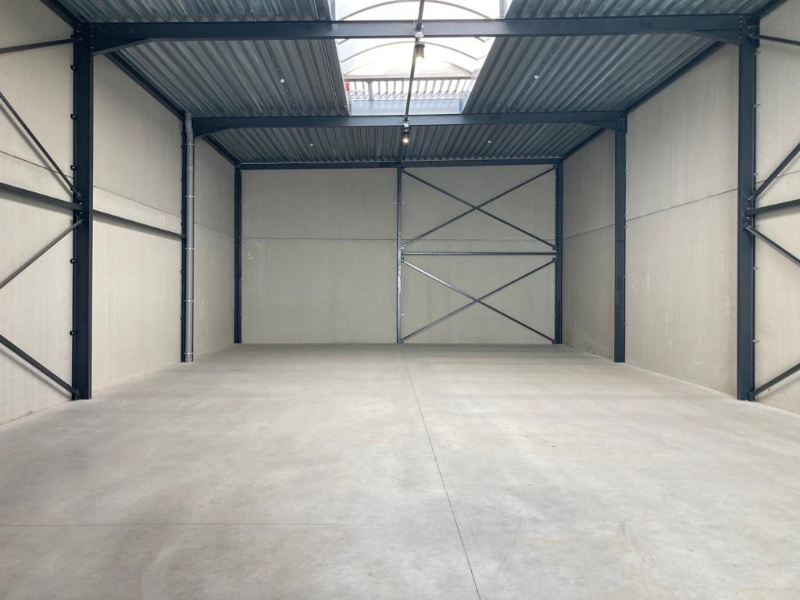 Uiterst goed gelegen nieuwbouw magazijn / opslagruimte van 287m² met automatische sectionaalpoort + 3 parkings.