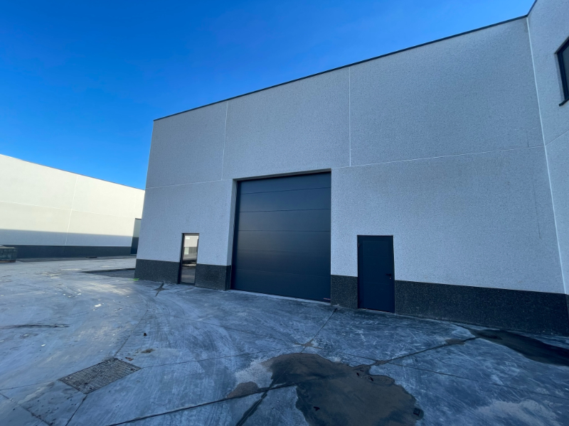 Magazijn is een stalen structuur met gevels in silexbeton-sandwishpanelen, geïsoleerde steeldeck, LED verlichting, lichtstraat, polybetonvloer, drijfkracht aanwezig, sanitair is aanwezig in het kantoor.