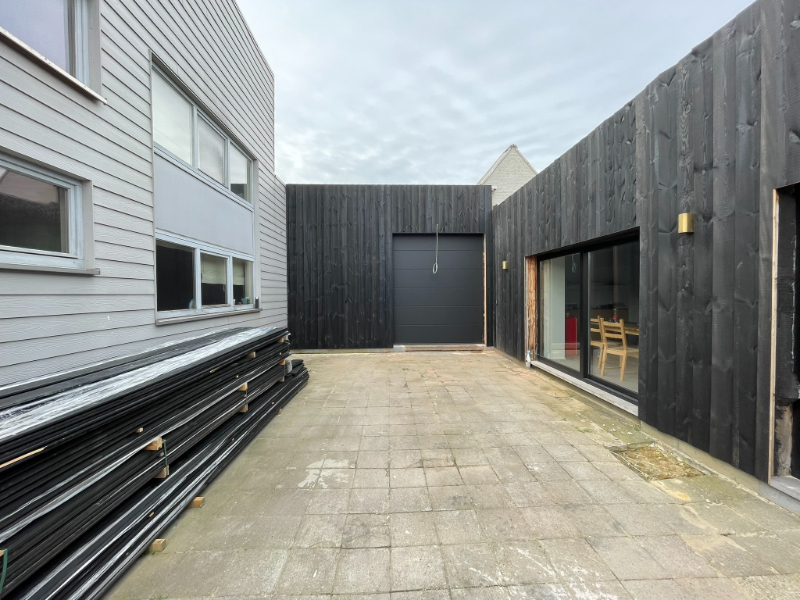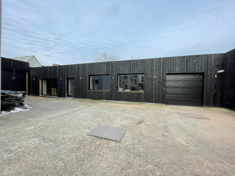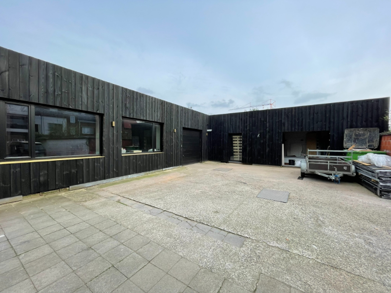 Het bedrijfsgebouw is deels gerenoveerd, de voorzijde is geïsoleerd en ingepakt met zwart behandelde houten planken, nieuwe raampartijen en goudkleurige verlichtingsarmaturen met zicht naar de private weg. Het kantoor zelf bestaat uit een inkom met verbinding naar 1 landscape ruimte en 2 aparte ruimtes. Deze zijn stijlvol afgewerkt met een tapijt, spots, zwart geschilderde plafond, indirecte verlichting en inmaakkasten. Het magazijn zelf bestaat uit 2 delen en 2 toegangen telkens met een automatische sectionale poort. De loodsen zijn heel lichtrijk en kunnen ook via een opening 1 magazijn worden.
