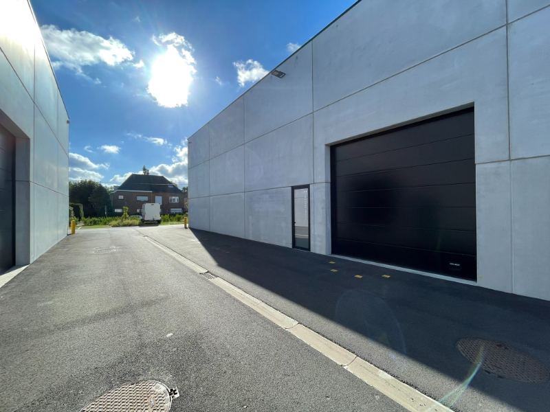 De loods is opgebouwd uit geïsoleerde betonnen panelen met plankenmotief, dak: geïsoleerde betonplaten, automatische sectionaalpoort, aparte toegangsdeur in aluminium schrijnwerk, polybetonvloer, waterput, lichtstraat, sanitair, LED verlichting, enkele stopcontacten en drijfkracht tot in het gebouw.