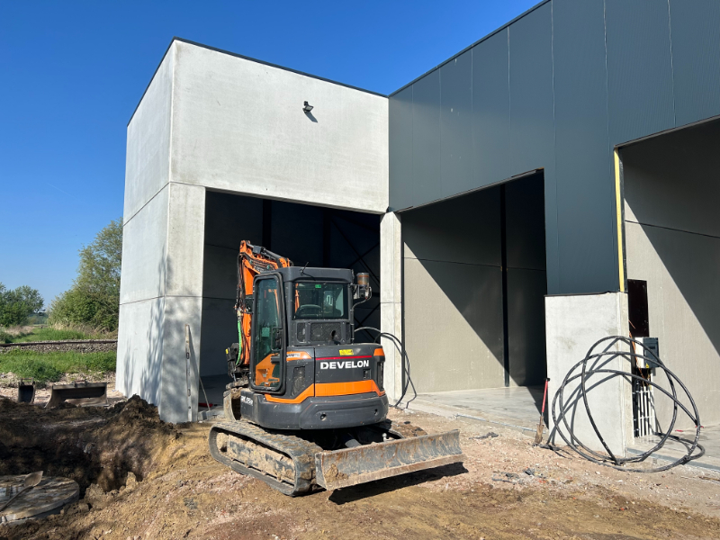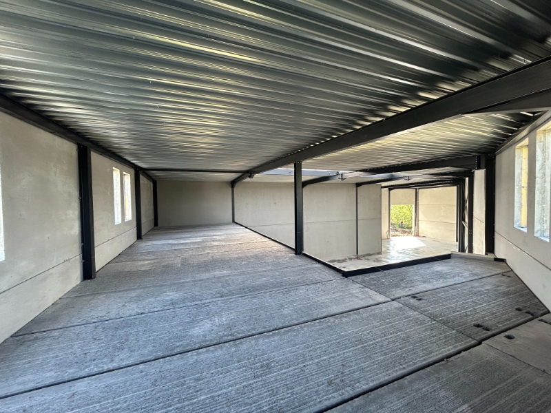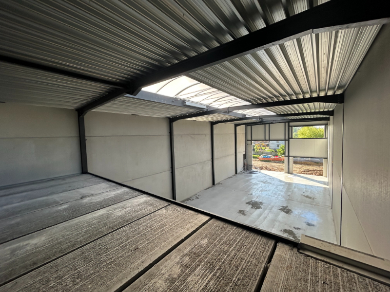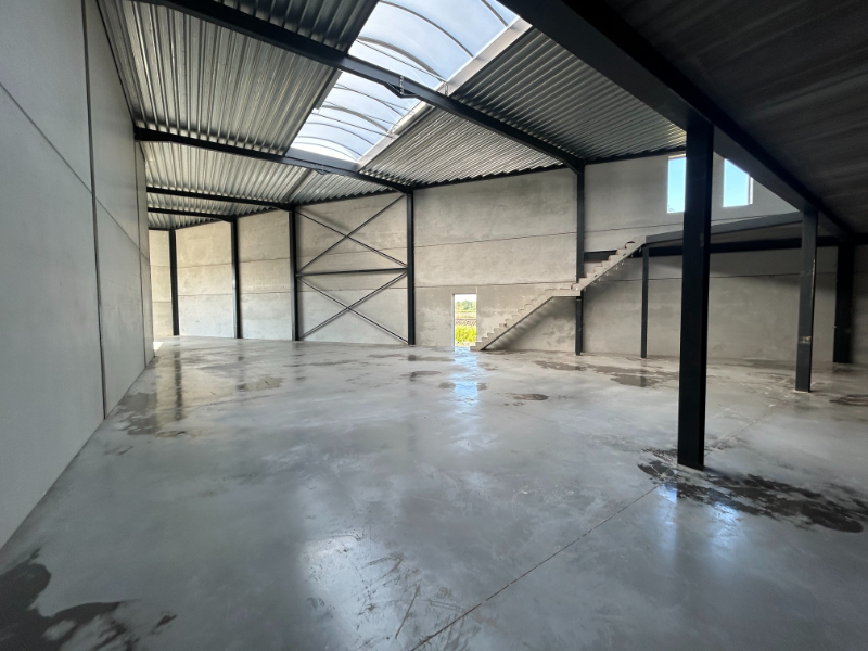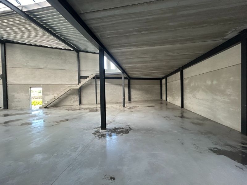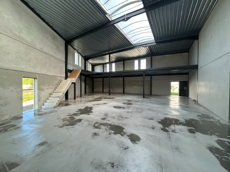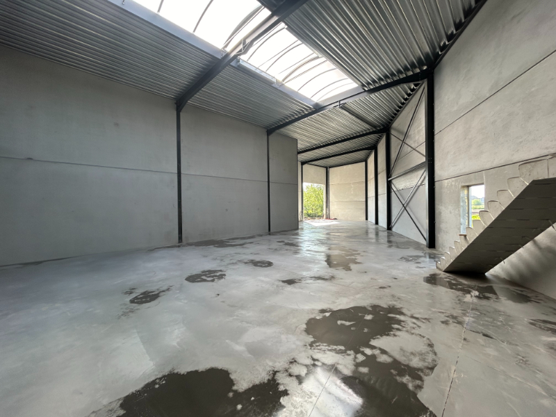 De loods maakt deel uit van een moderne KMO-site en is opgetrokken in een duurzame staalstructuur met betonnen panelen. Het gebouw beschikt over een stevige polierbetonvloer, een binnenhoogte van 6 meter, een sectionale poort en drijfkrachtvoorziening. Daarnaast zijn er aansluitingen voor sanitair aanwezig, net als een septische put en een regenwaterput. Branddetectie is reeds voorzien, en het geheel is afgewerkt met aluminium schrijnwerk.