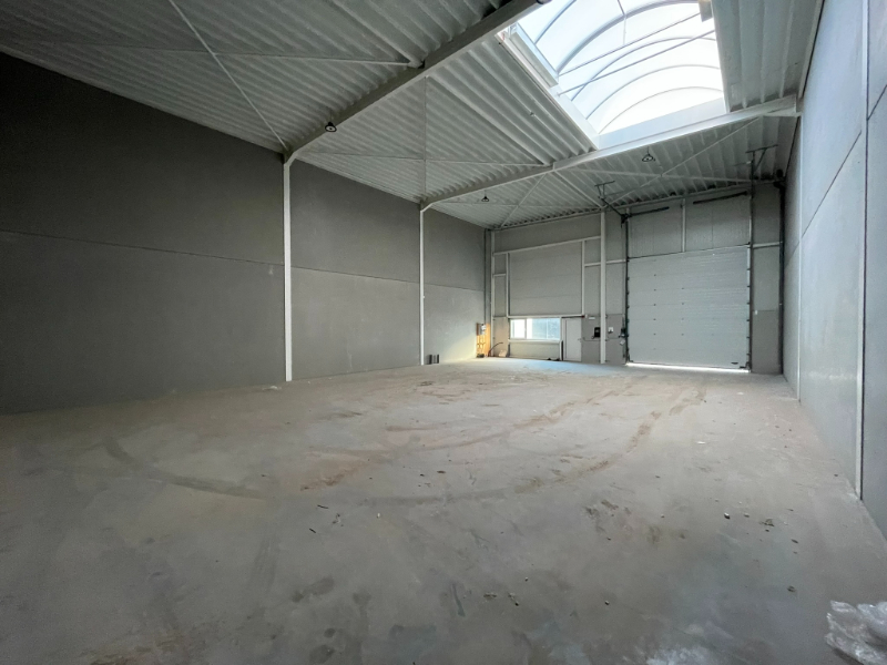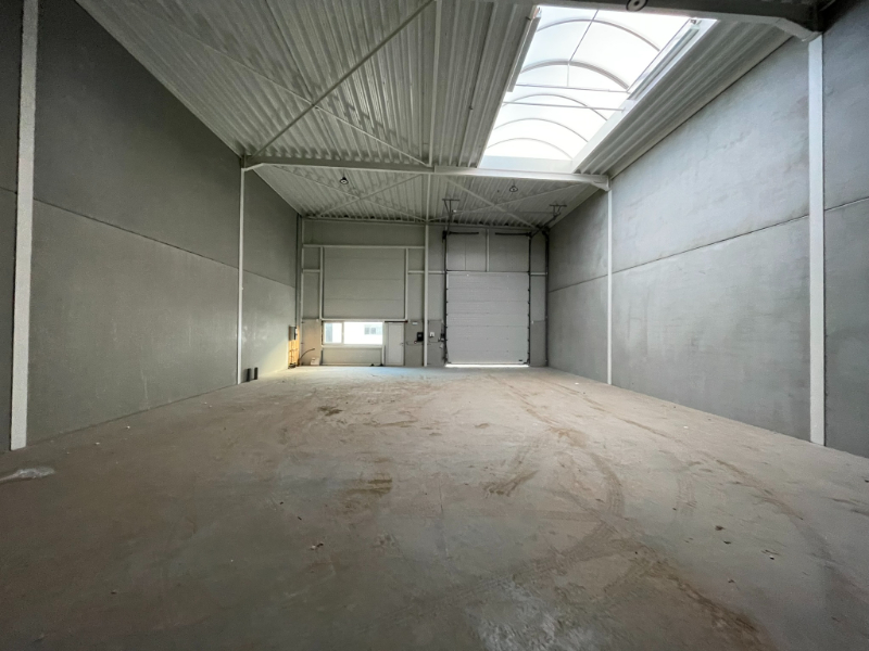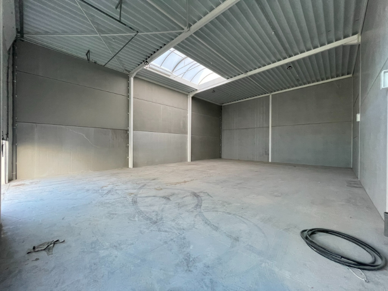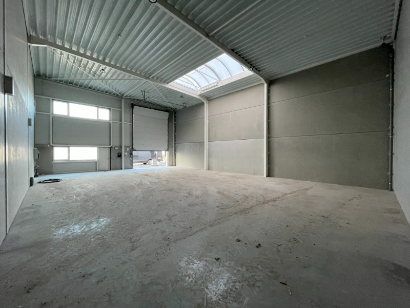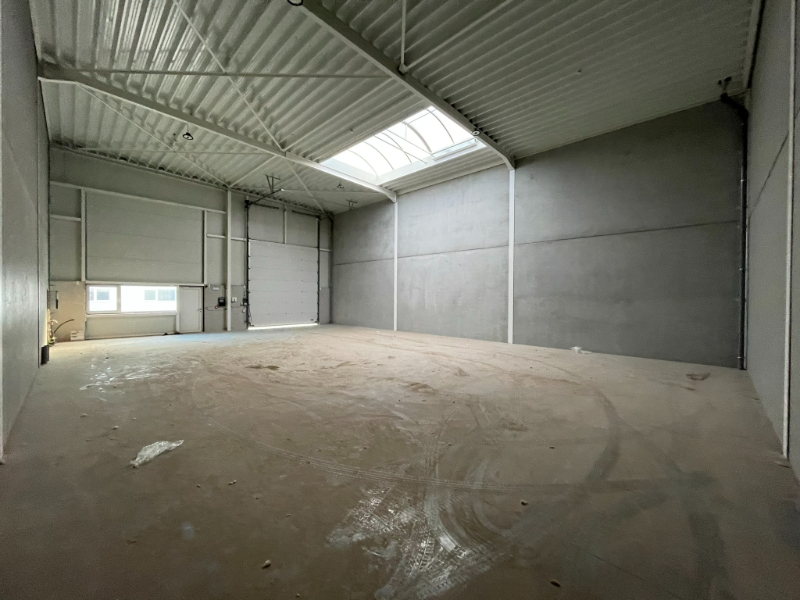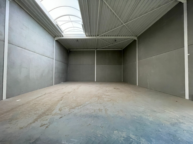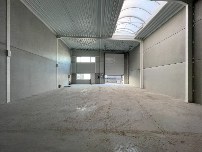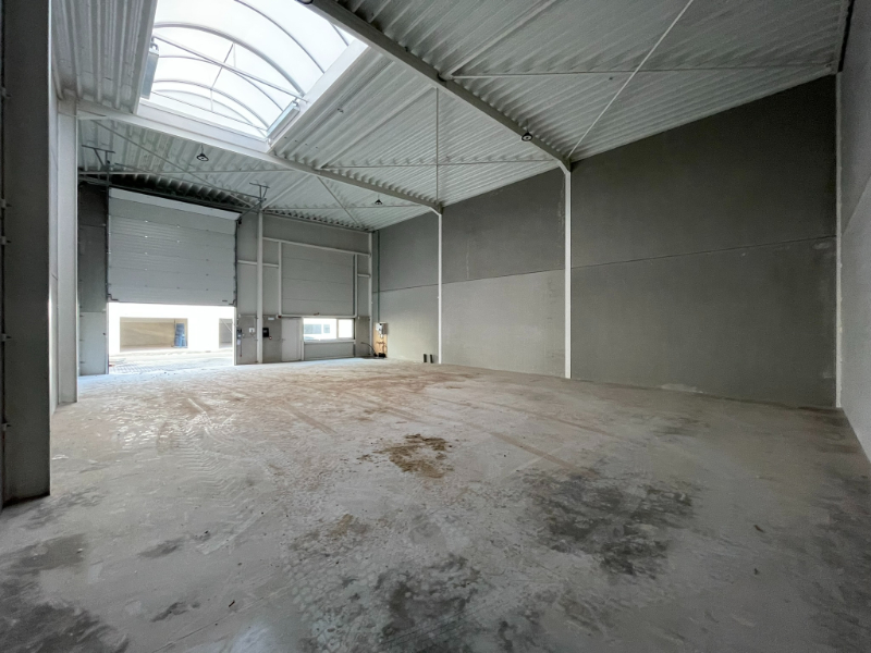 De ruimte is ideaal voor opslag- of atelierruimte en werd gebouwd met hoogwaardige materialen. De unit is opgetrokken in staalstructuur met architectonisch beton en aluminium sandwichpanelen, voorzien van een geïsoleerd steeldeckdak met lichtstraat. Een automatische sectionale poort (4 m breed x 4,5 m hoog) garandeert een gemakkelijke toegang, en de polybetonvloer biedt een draagkracht van 2,5 T/m². De vrije hoogte bedraagt minstens 6 meter.