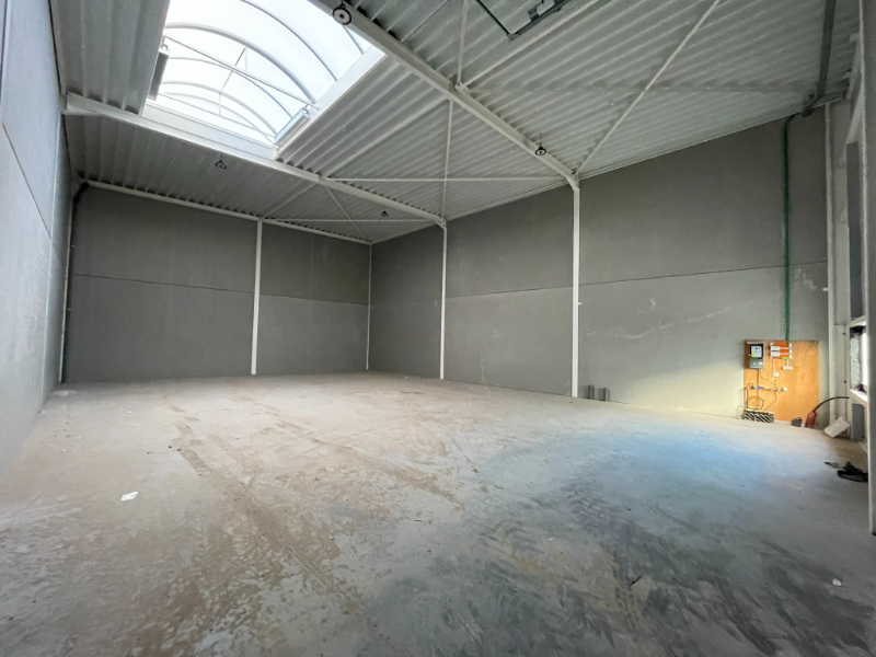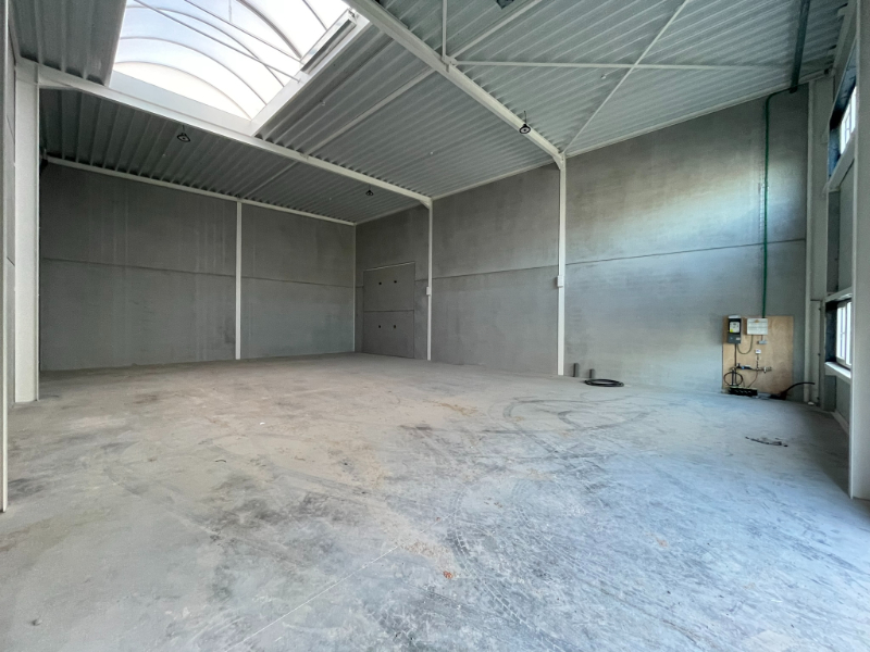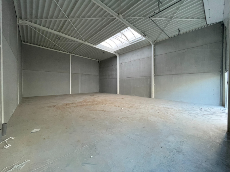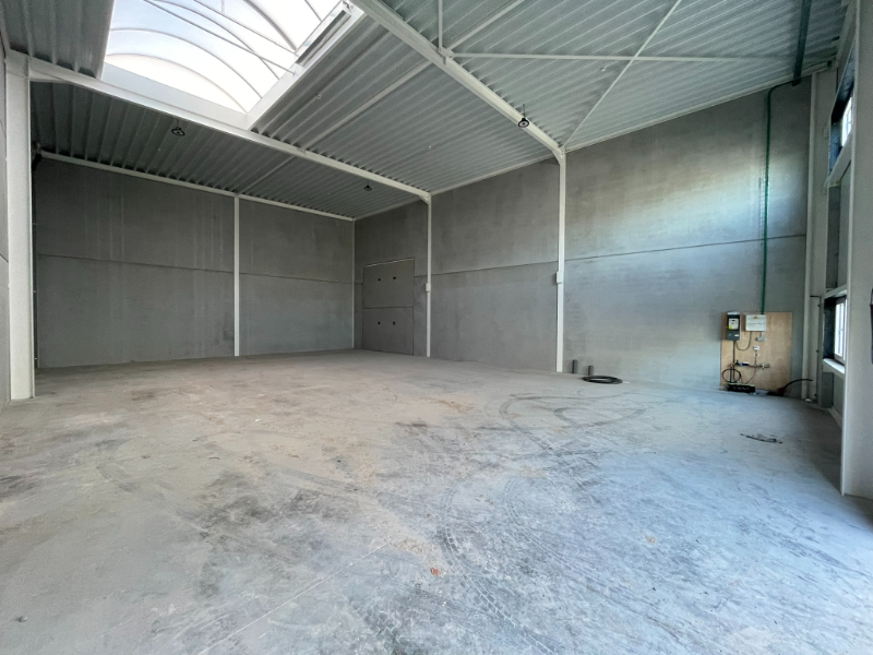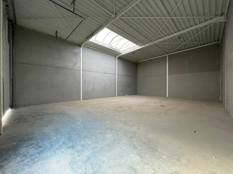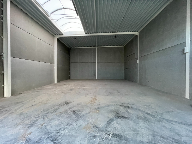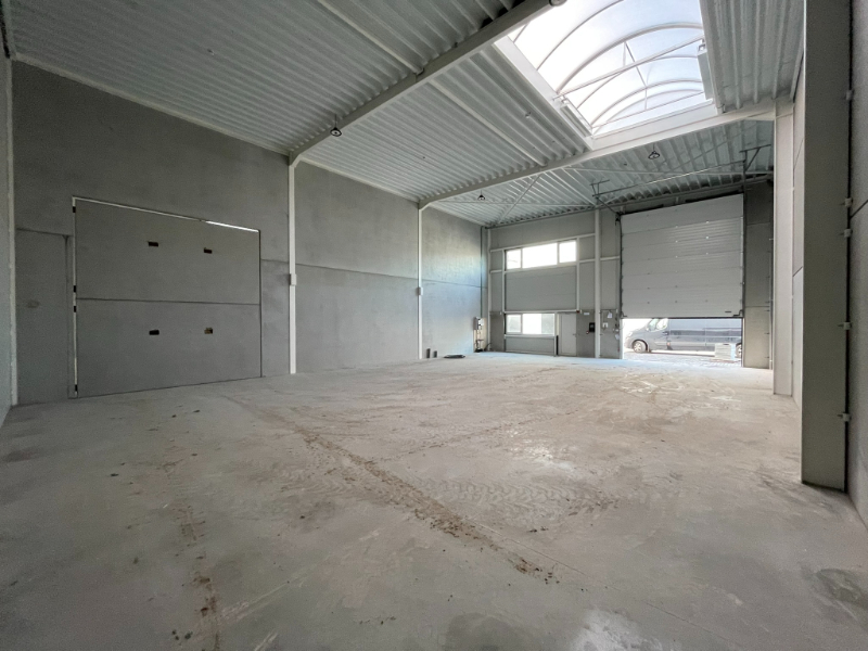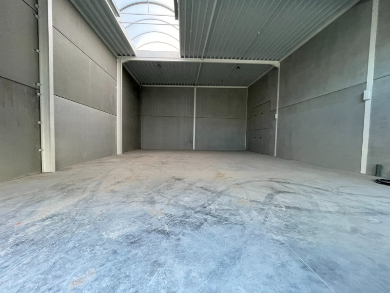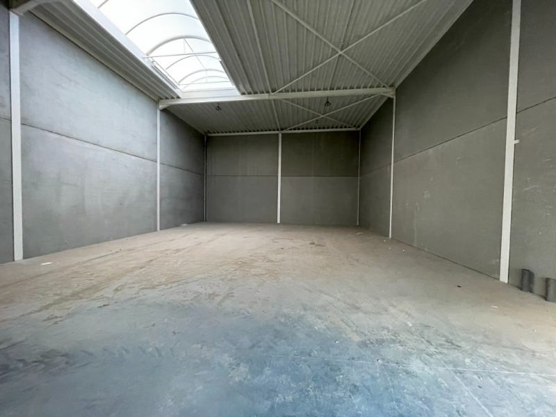 De ruimte is ideaal voor opslag- of atelierruimte en werd gebouwd met hoogwaardige materialen. De unit is opgetrokken in staalstructuur met architectonisch beton en aluminium sandwichpanelen, voorzien van een geïsoleerd steeldeckdak met lichtstraat. Een automatische sectionale poort (4 m breed x 4,5 m hoog) garandeert een gemakkelijke toegang, en de polybetonvloer biedt een draagkracht van 2,5 T/m². De vrije hoogte bedraagt minstens 6 meter.