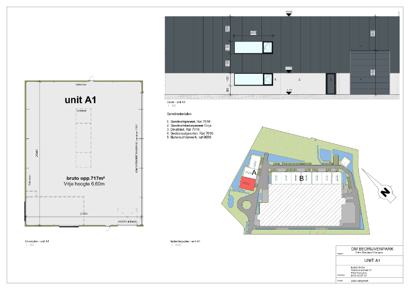 De units worden casco opgeleverd. Staalstructuur met plint van 2.4m hoog en geïsoleerde sandwichpanelen, polierbetonvloer, vloer met puntbelasting van 3 ton/m² tussenwanden zijn in beton en 14cm dik, dak is in steeldeck, lichtstraten van 3x12meter, sectionaalpoort, alu schrijnwerk.