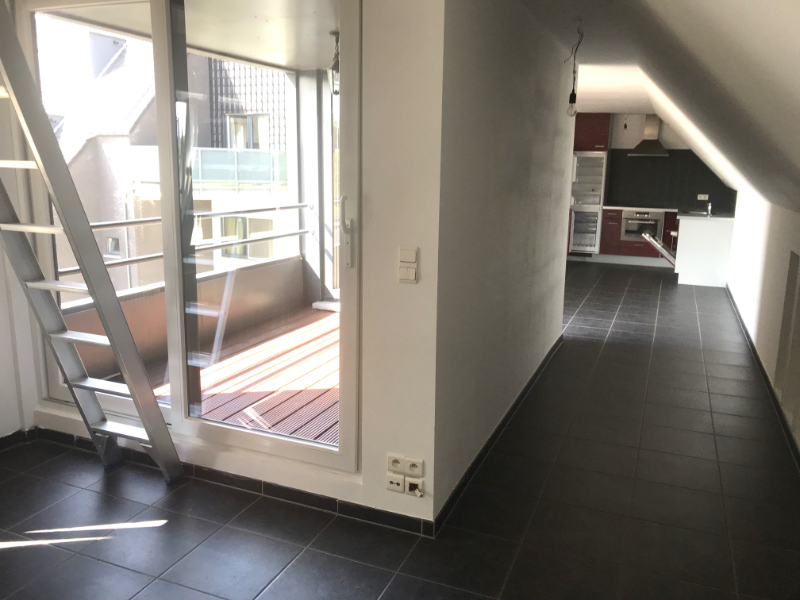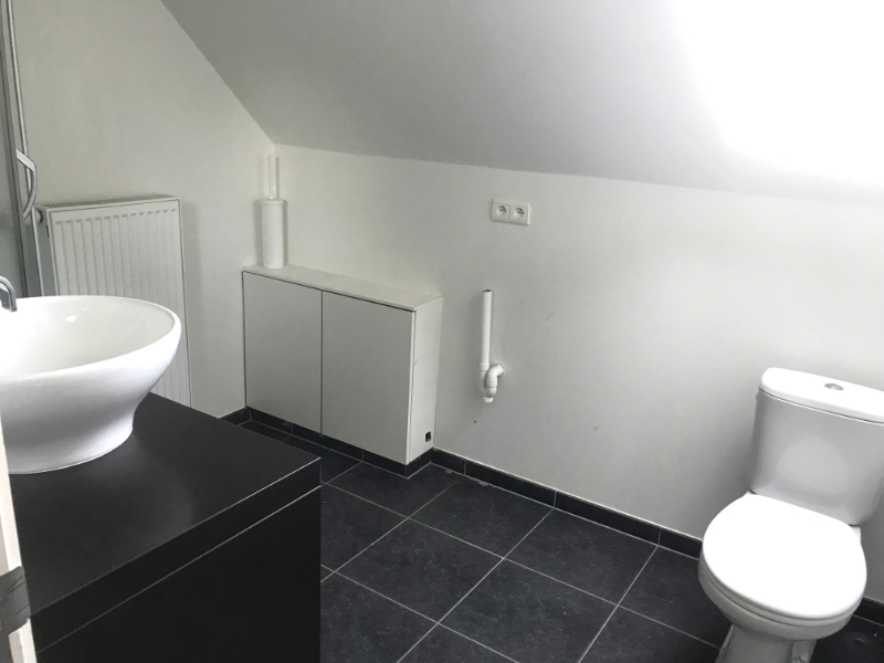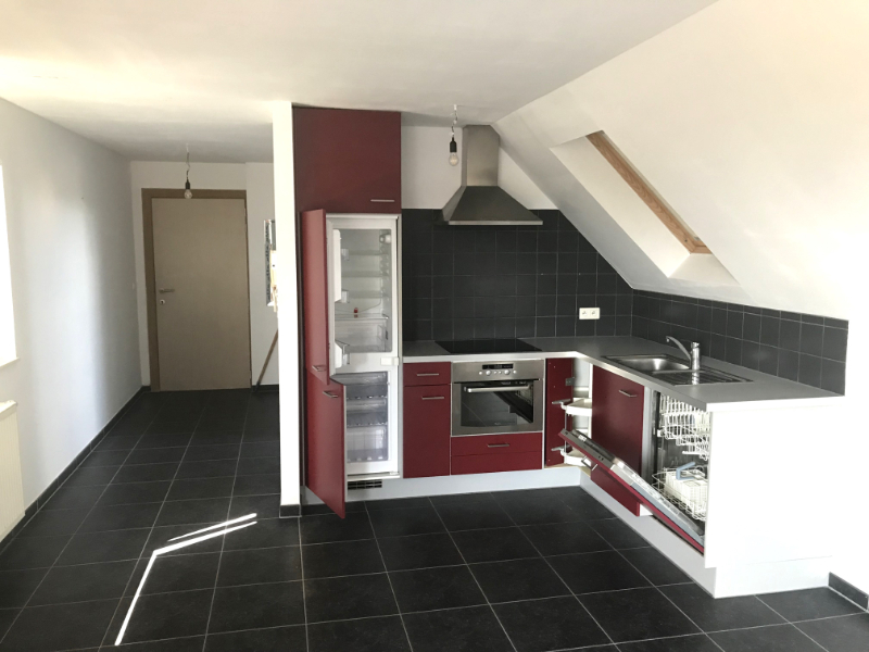 Trendy Loft appartementje 60 m², inkomhal , badkamer met lavabo meubel, douche, toilet en aansluiting voor wasmachine, living met keukenhoek (koelkast, diepvries, vaatwas, combi oven), met zon georiënteerd terras, slaapruimte en op verdiep, een afgewerkte zolderruimte ; EPC 267 KWH/m² ; HP 575 Euro + 25 Euro provisie AO ; met autostaanplaats ; individuele tellers gas, water en elektriciteit ; internet aansluiting ;