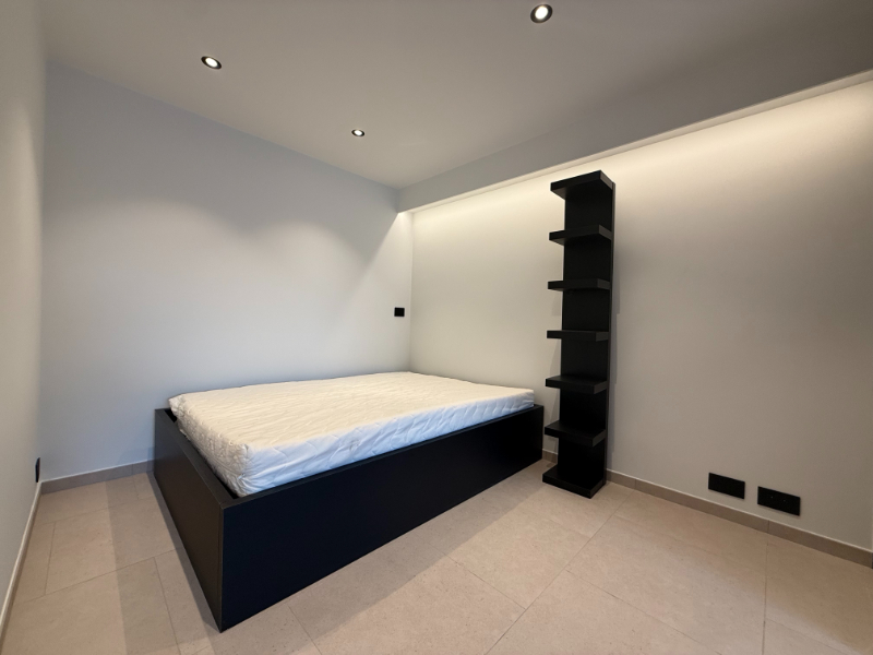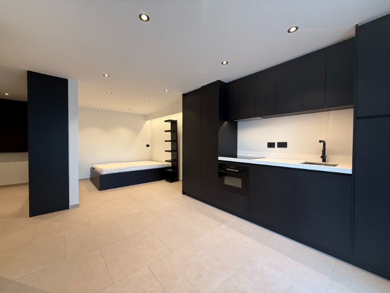 De studio omvat een inkomhal met bureau en ingemaakte kasten, een open slaapgedeelte en een aangename leefruimte met luxueuze open keuken. De keuken is volledig uitgerust met een vaatwasser, koelkast met diepvriesvak, kookplaat, combi-oven en dampkap.