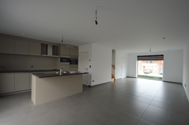 Op het gelijkvloers bevindt zich een inkomhal met gastentoilet, gevolgd door een lichtrijke leefruimte met open, volledig ingerichte keuken. De keuken is uitgerust met kwalitatieve toestellen, waaronder een vaatwasser en combi-oven.