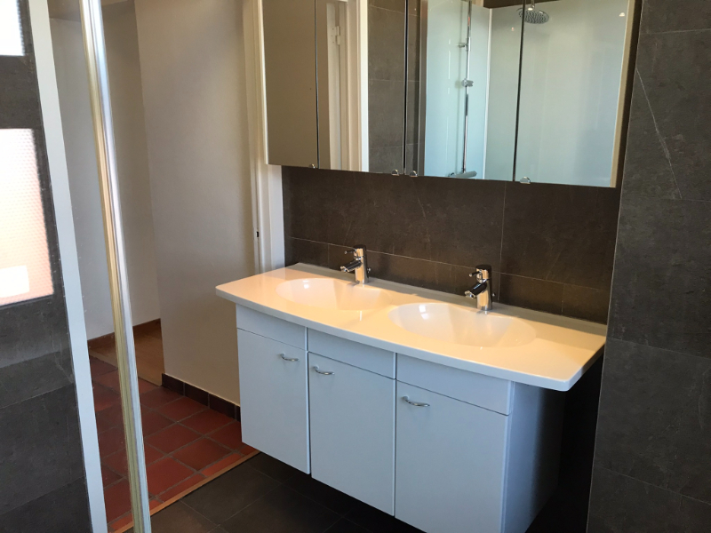 Een nachthal met de 3 slaapkamers en de badkamer (voorzien van lavabomeubel met 2 lavabo’s), en een douche.